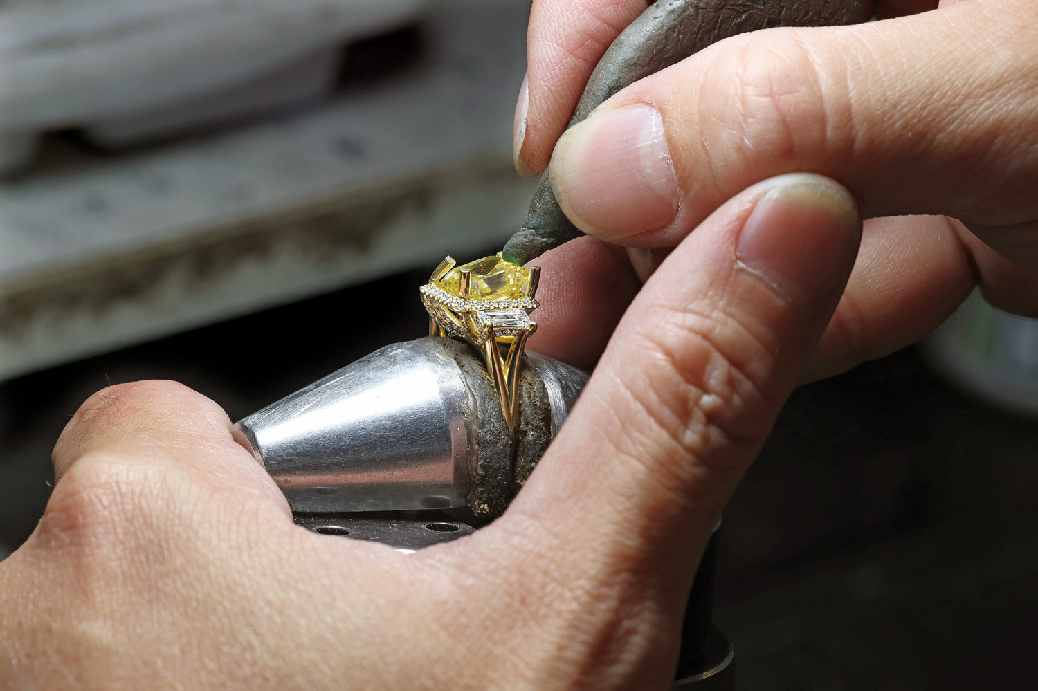 Once the jewellery item has been expertly shaped, it is entrusted to our specialist setters, who work with precision under a 10 times magnification microscope to set the gems into the gold.