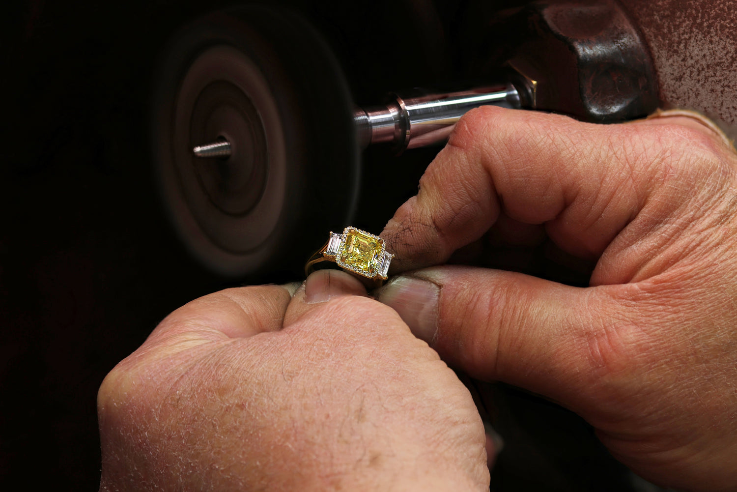 The final stage of the bespoke jewellery process is polishing, where the true brilliance of each piece is revealed. Our skilled technicians use precision wheel buffs, beginning with a firm wheel and gradually moving to a softer one, to achieve a flawless, radiant finish.