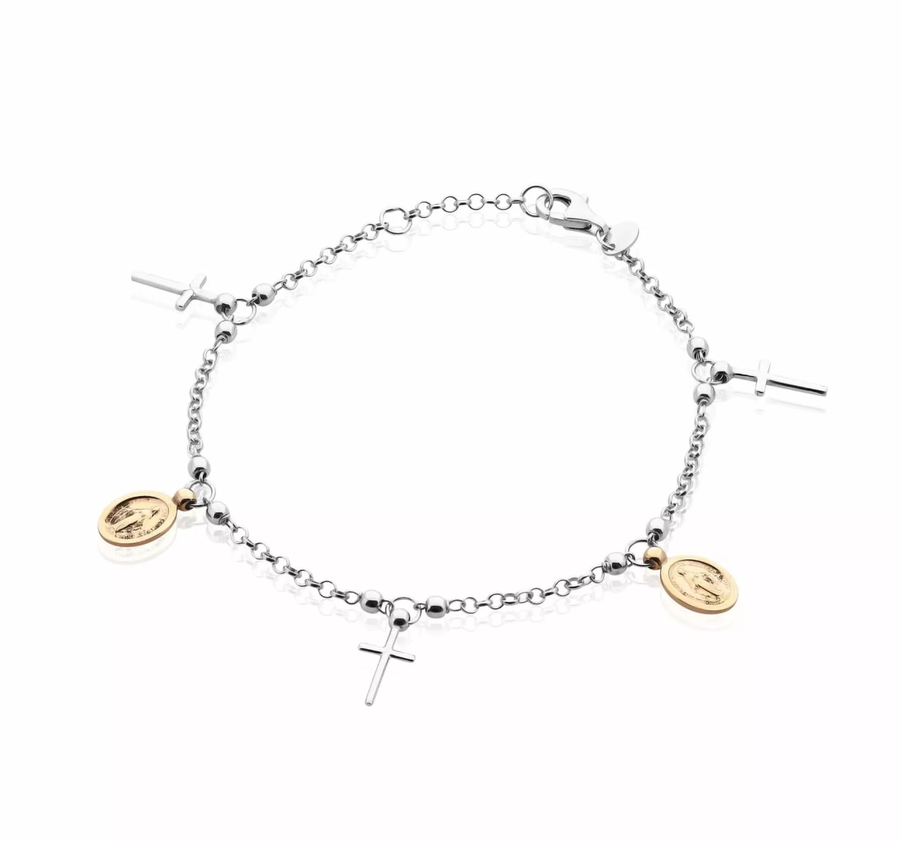18ct white and rose gold cross & rosary charm bracelet. Size: 19cm