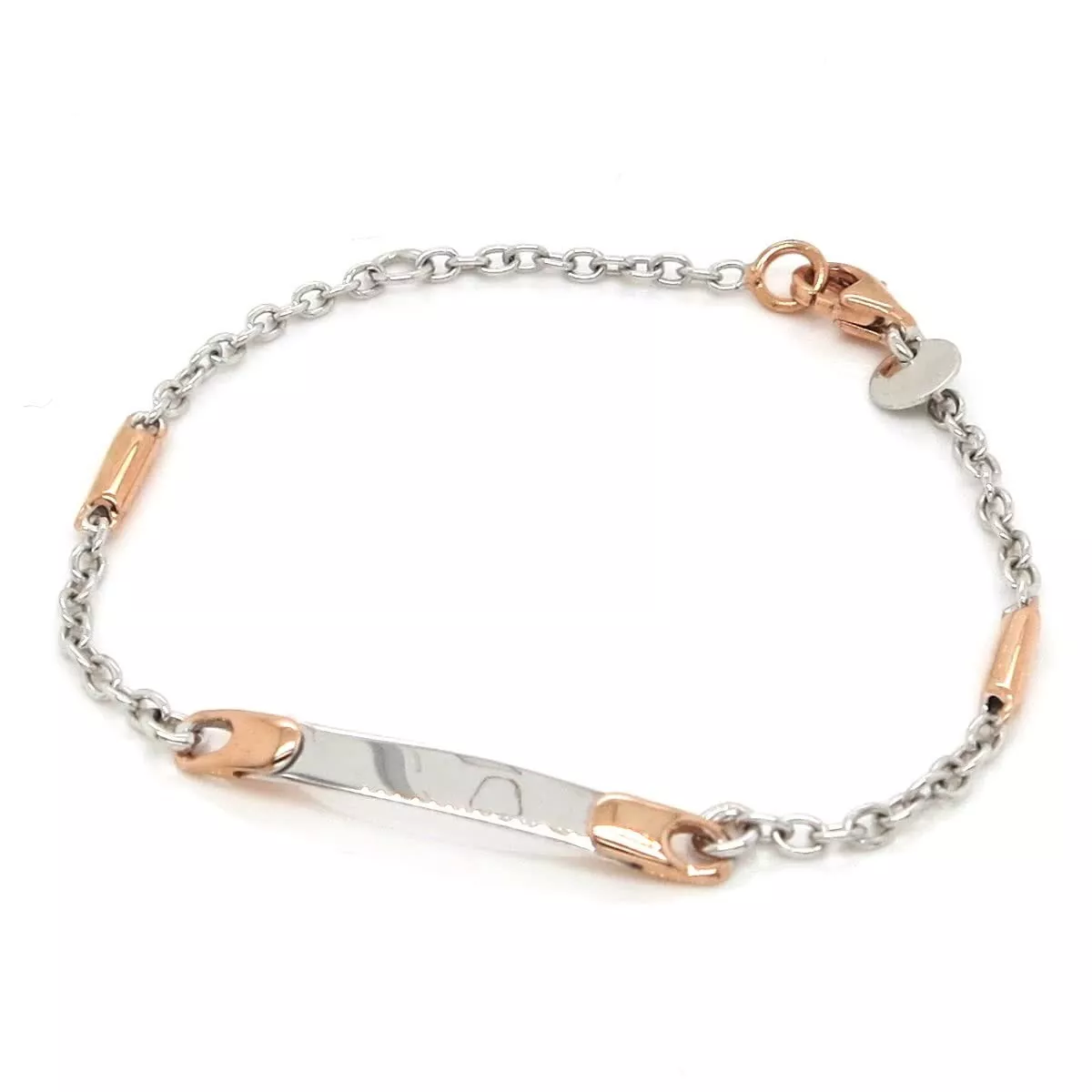 18ct white and rose gold ID tag baby bracelet. Length= 14cm.