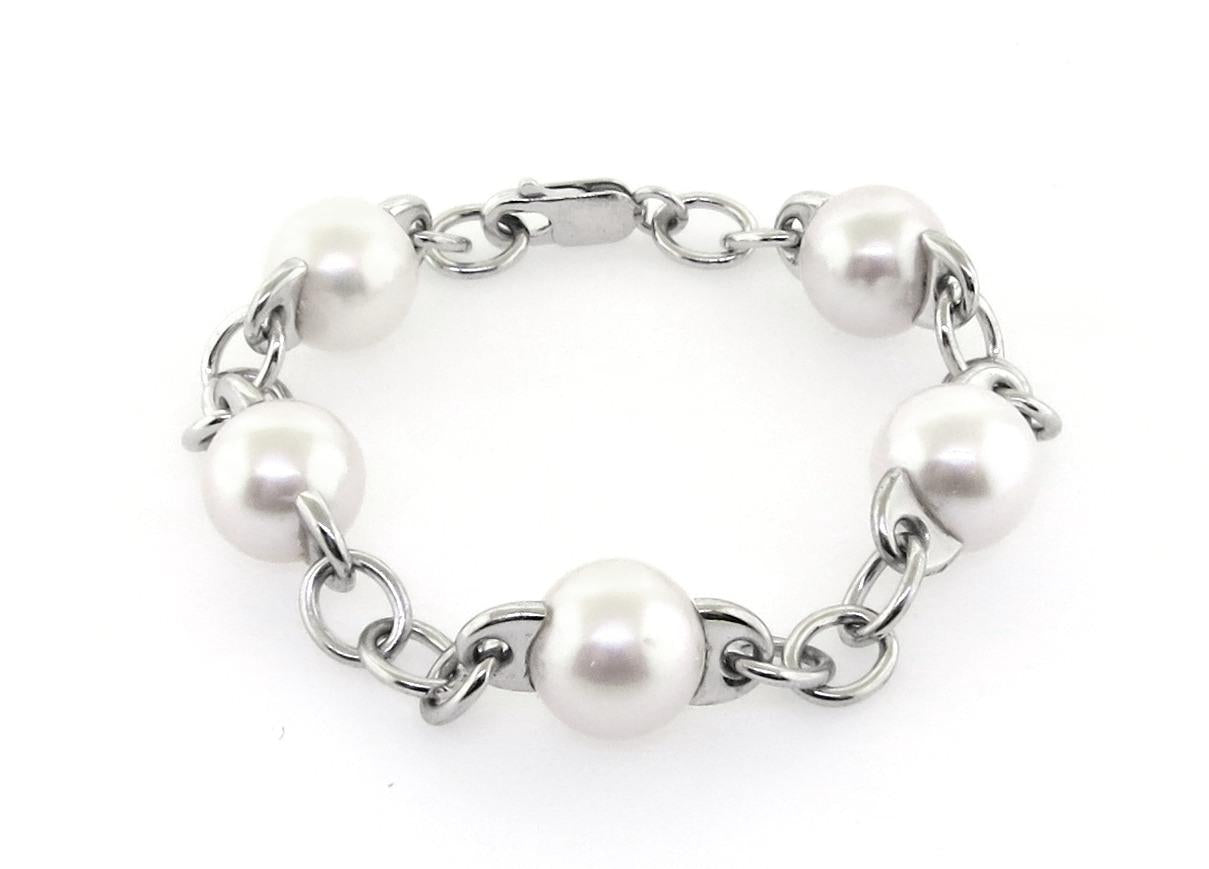 18ct white gold fresh water pearl 17.5cm bracelet features 5=10-10.5mm fresh water pearls. Item weight is 17.72 grams. Parrot clasp.