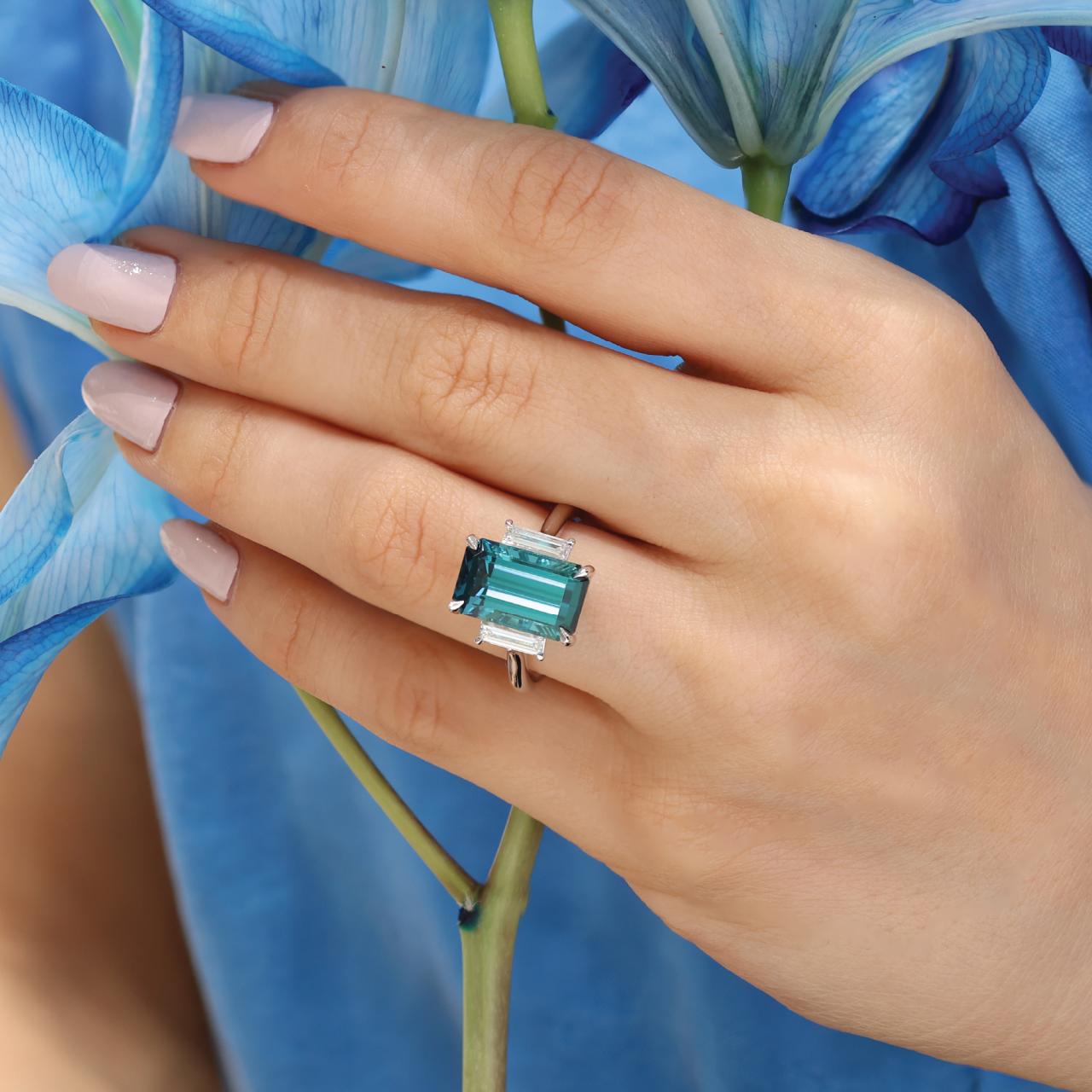 18ct white gold 6.10ct baguette cut indicolite tourmaline & diamond ring. 2=0.39ct baguette diamonds. Ring size L