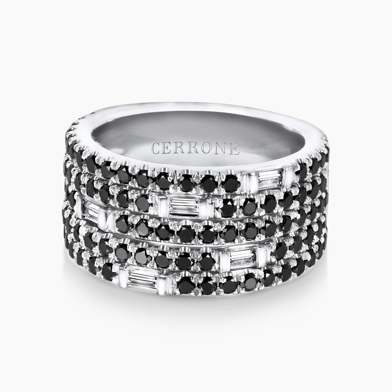 18ct white gold baguette and round brilliant cut black diamond ring. Featuring 5=0.21ct baguette diamonds and 100=1.59ct round black diamonds. Ring size L