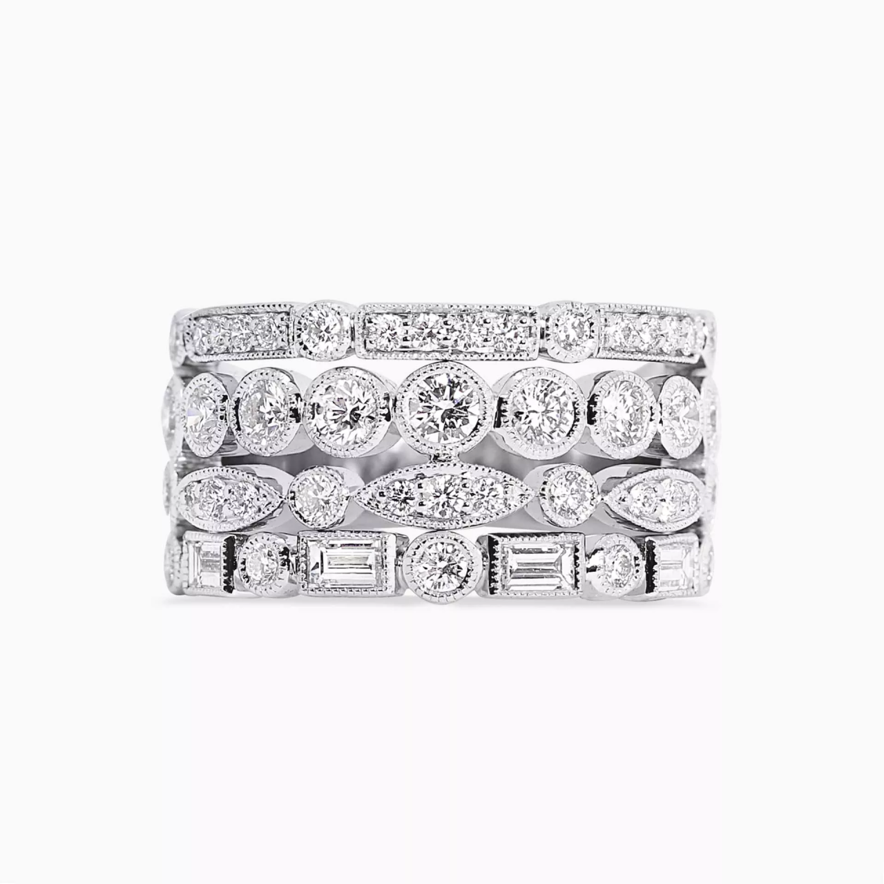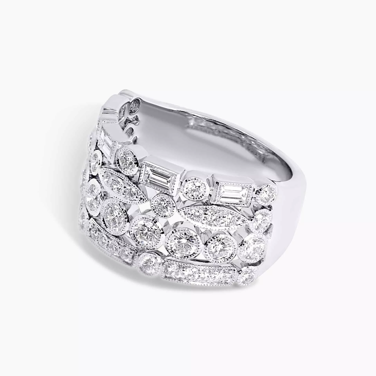 18ct white gold baguette and round brilliant cut diamond dress ring. Featuring 47=1.62ct diamonds.
