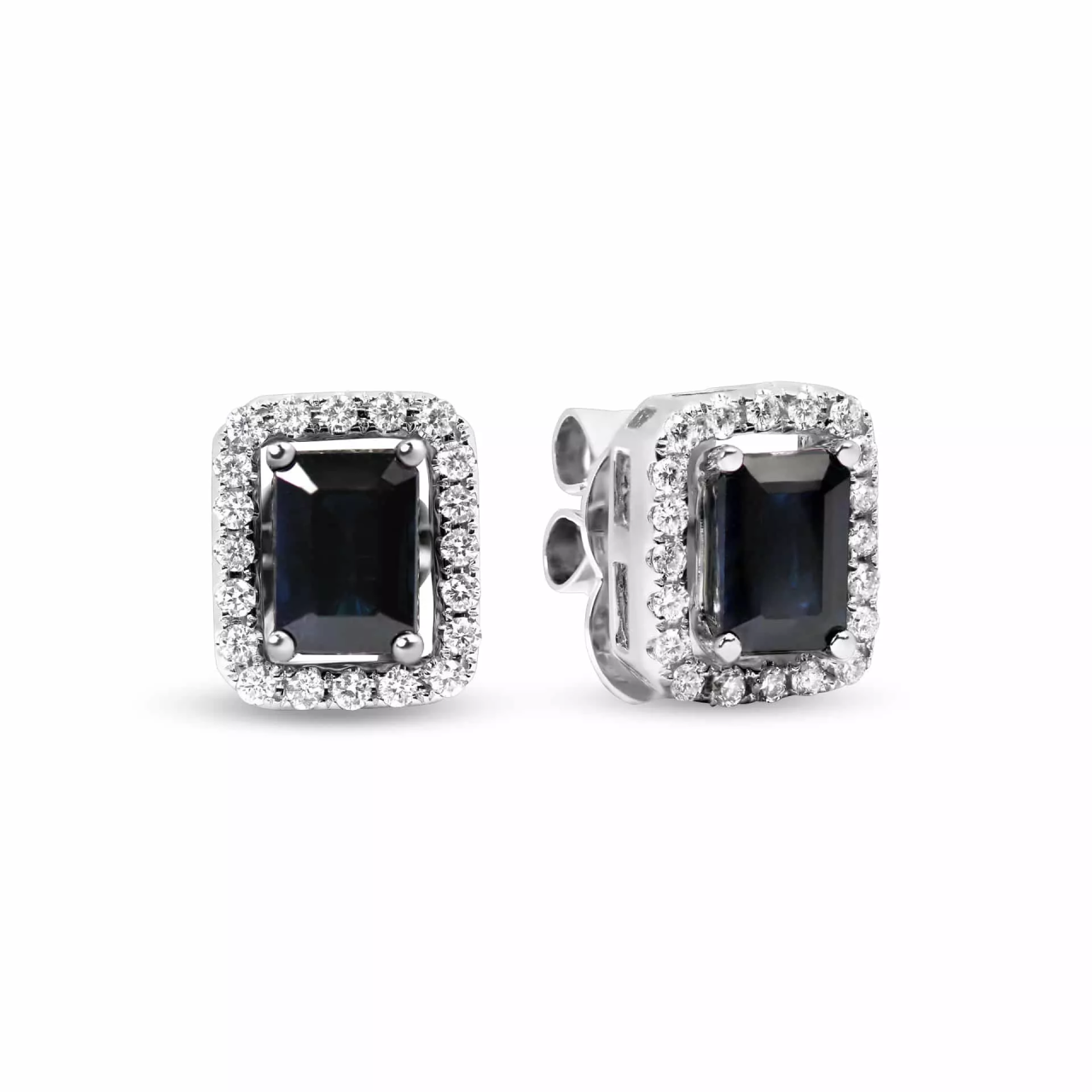 18ct white gold blue sapphire & diamond halo stud earrings. BS 2=2.77ct, D40=0.38ct