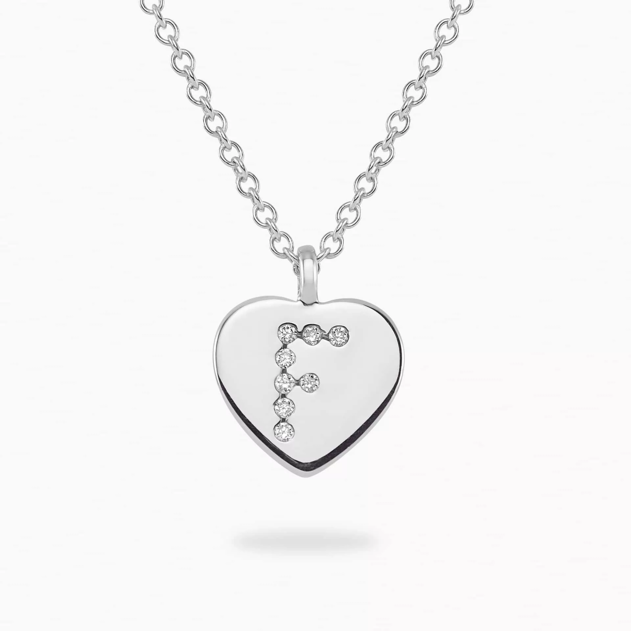 18ct White Gold Diamond “F” Initial Heart necklace. D8=0.06ct. Length of chain= 45cm