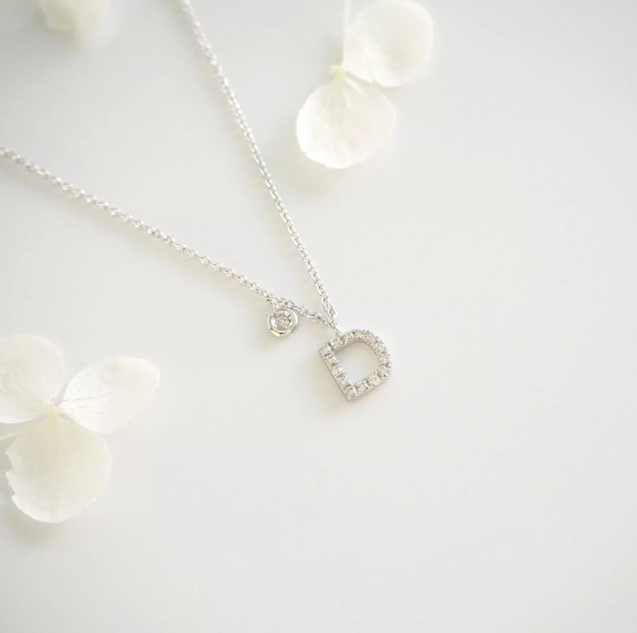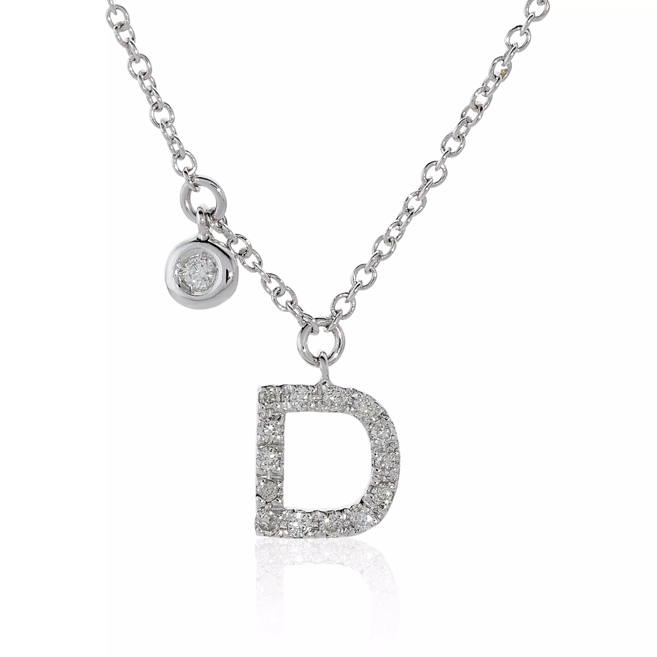 18ct white gold diamond initial “D” Necklace. D=0.08ct. Length= 42cm
