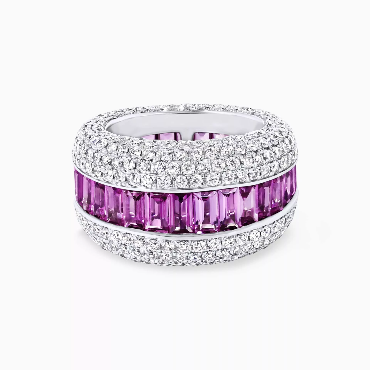 18ct white gold graduated emerald cut pink sapphire and pave set round brilliant cut diamond dress ring