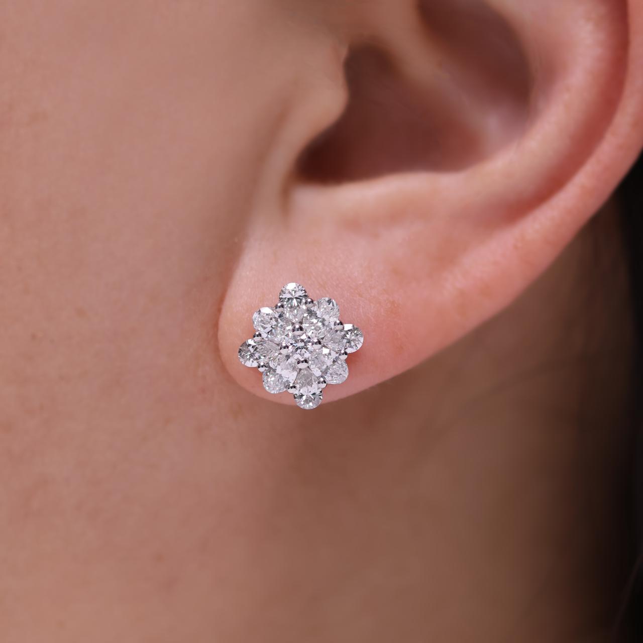 18ct white gold pear oval and round cut diamonds cluster stud earrings. Featuring 8=1.18ct pear shaped diamonds, 8=1.02ct oval diamonds and 2=0.13ct round brilliant cut diamonds in a claw setting.