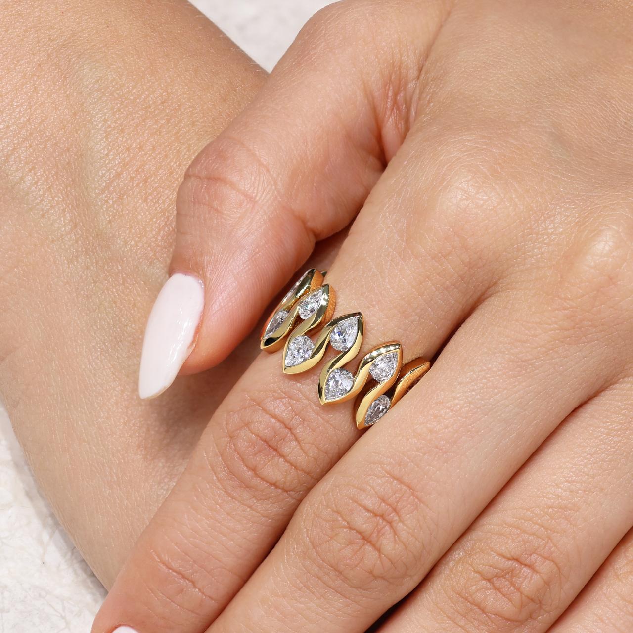 18ct yellow gold 3.68ct pear shape diamonds ring features 20=3.68ct pear shape diamonds in a tension setting. Ring size M.