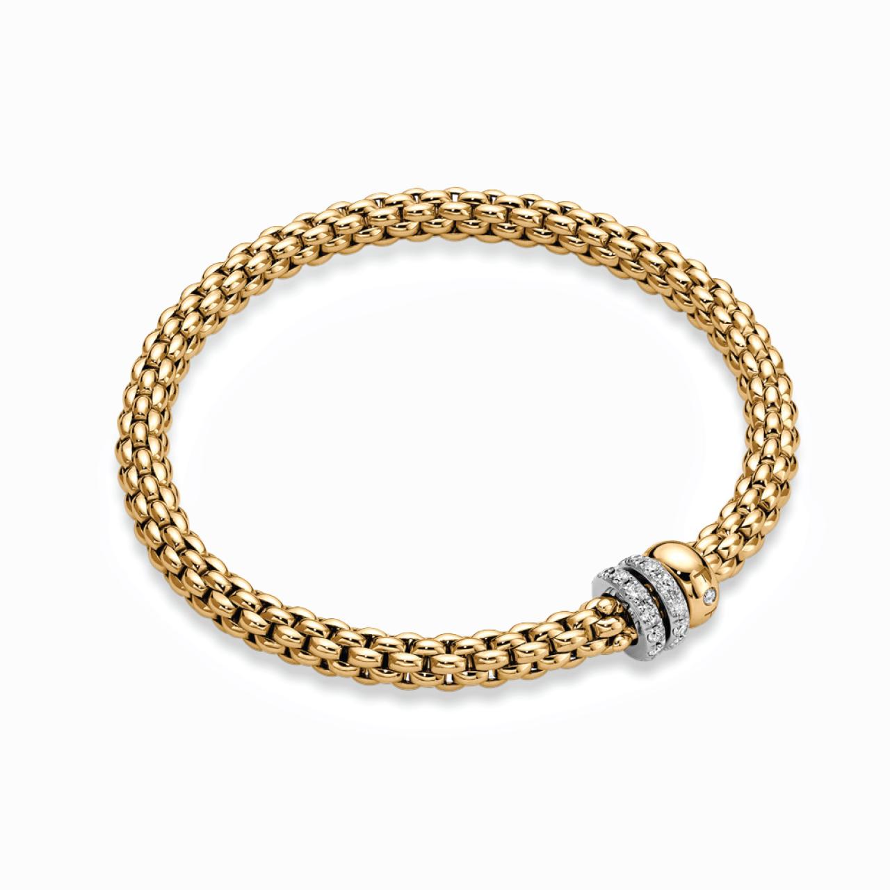 18ct yellow gold mesh 'FOPE' Solo Collection: Flex'it bracelet with two pave set rondels and one gold with drop set diamond rondel