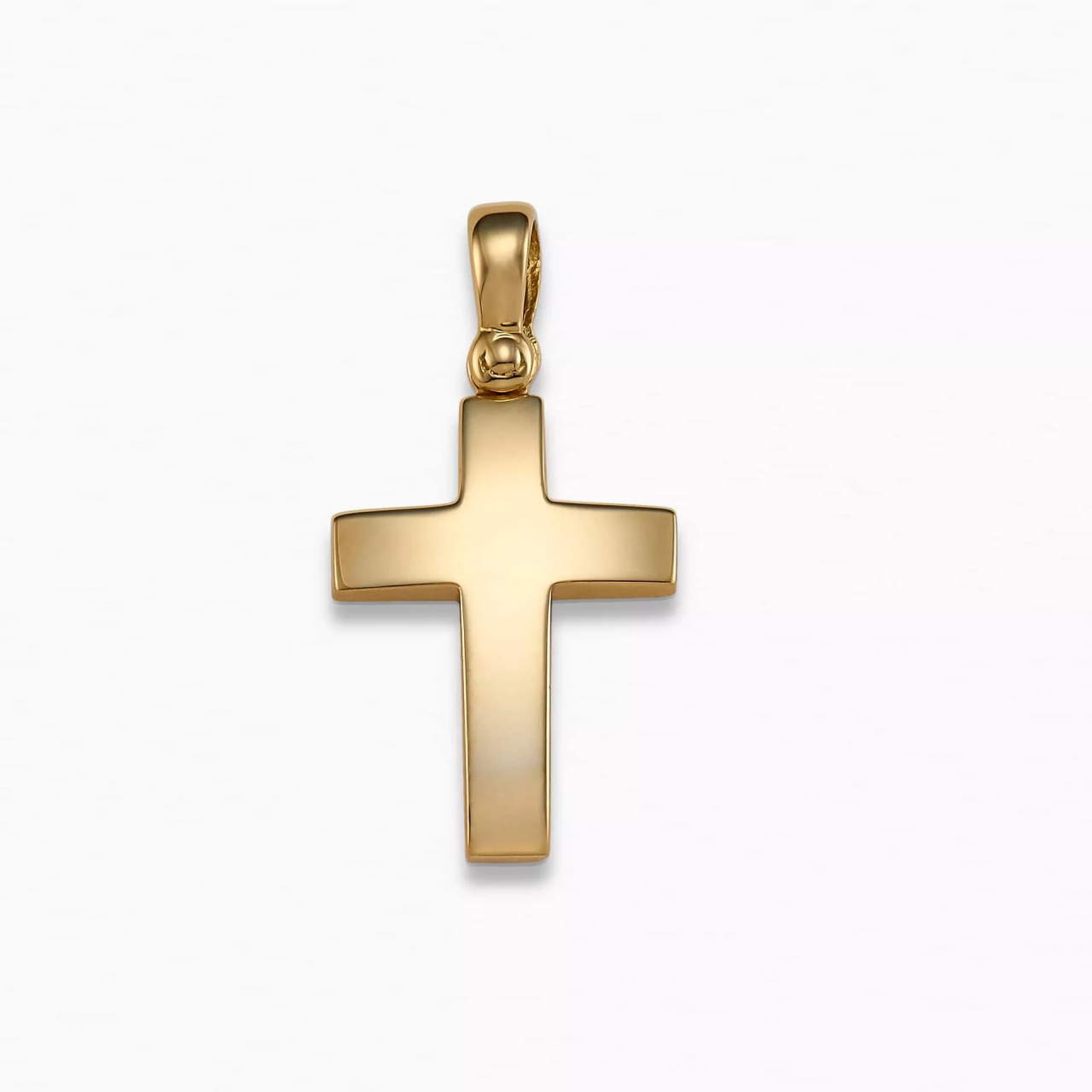 18ct yellow gold plain cross pendant. Length of cross including bale= 2.5cm / Length of cross= 1.8cm / width of cross= 1.3cm