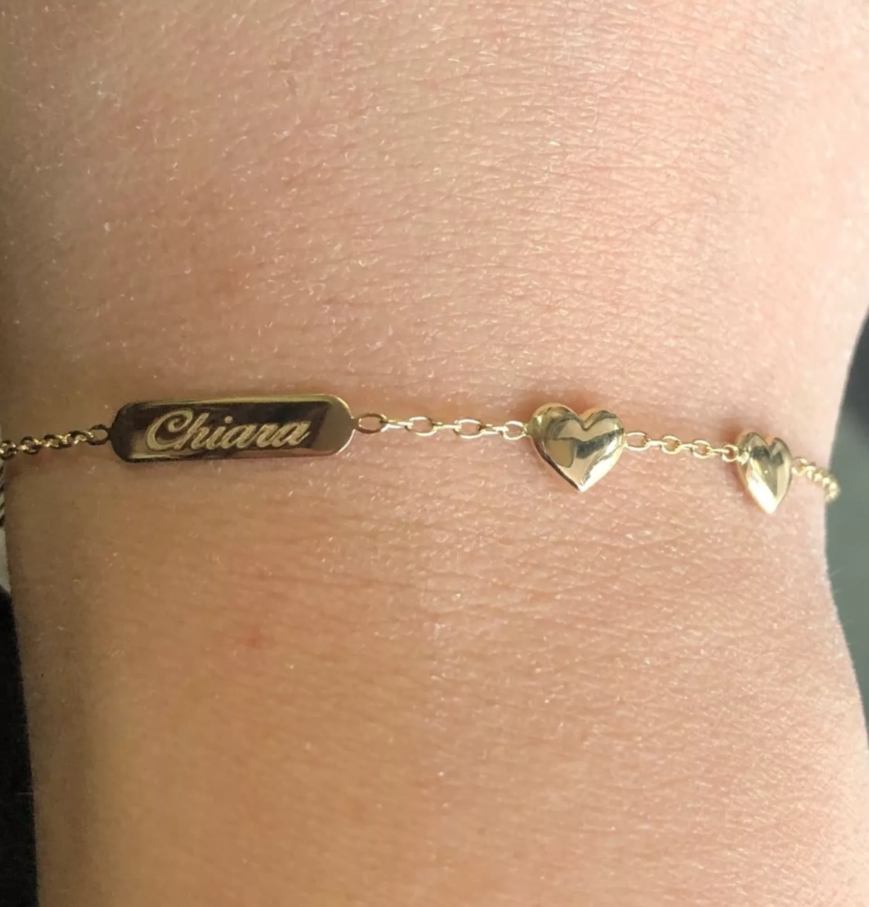 18ct Yellow Gold two Hearts & ID Baby Bracelet. Length of bracelet= 14cm / Smaller loop= 12cm / Length of ID Plate= 1.3cm / Width of ID plate= 0.3cm