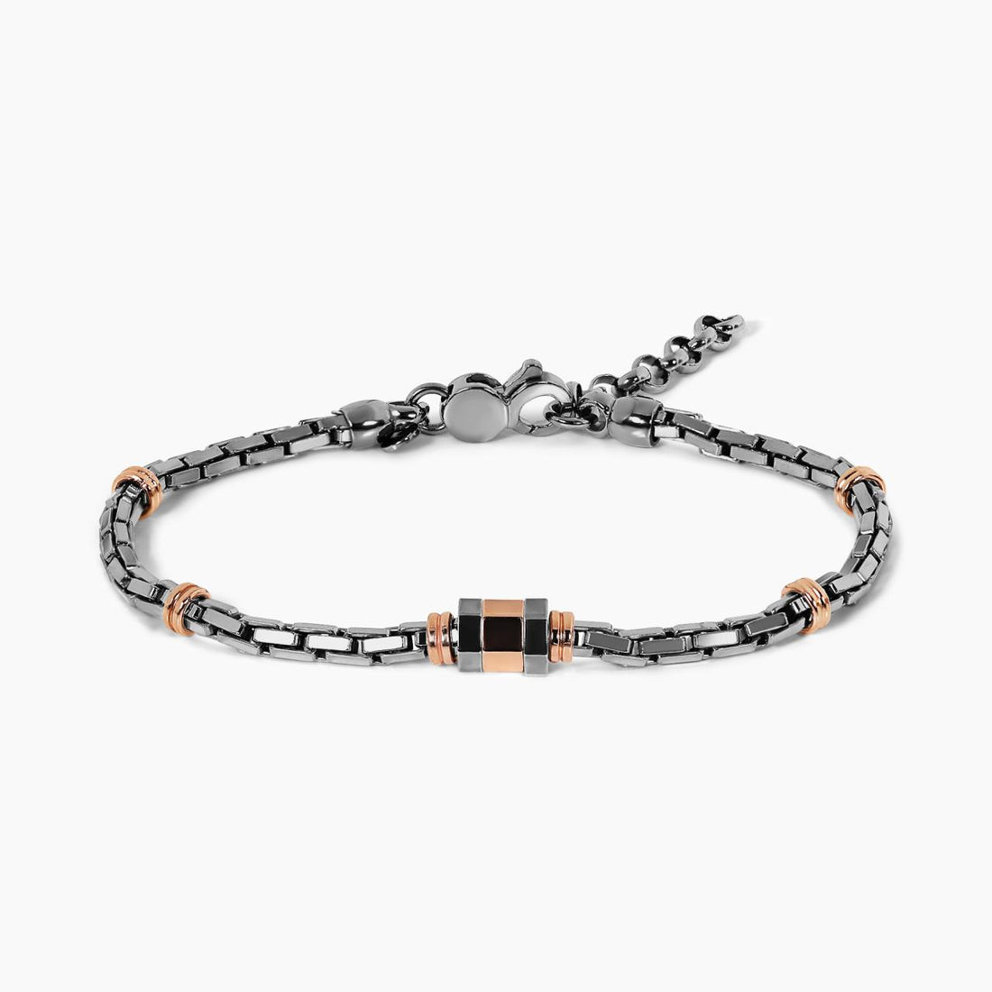 Bi-colour (Black Rhodium/ Rose gold) plated silver men's bracelet. Item length is adjustable from 19cm up to 21cm