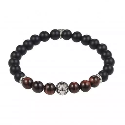 Black agate, red tiger eye and antique stainless steel beaded mens bracelet