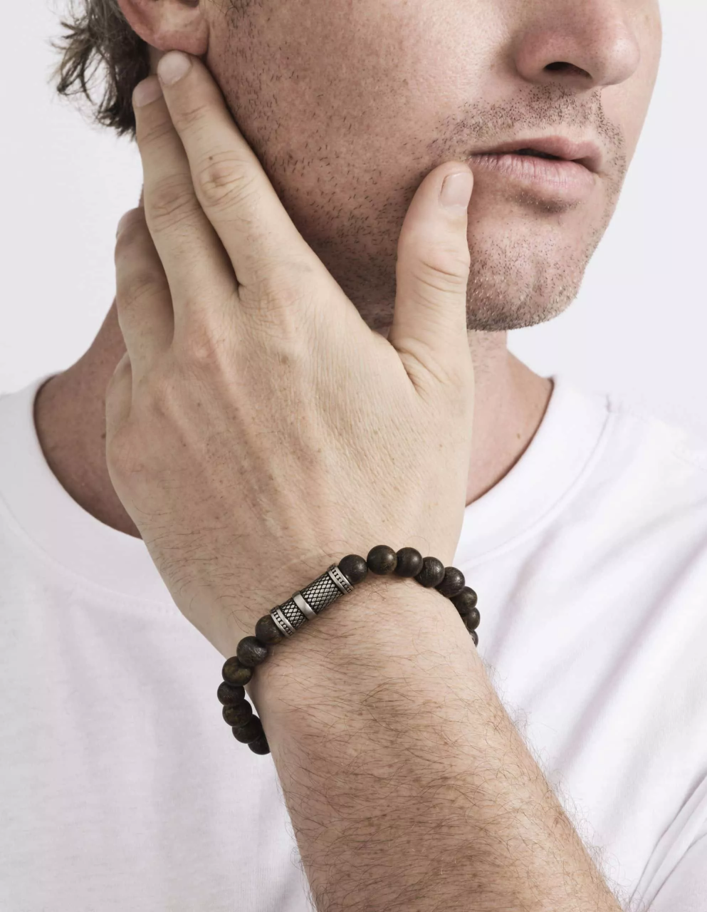 Bronzite and stainless steel beaded stretchy mens bracelet