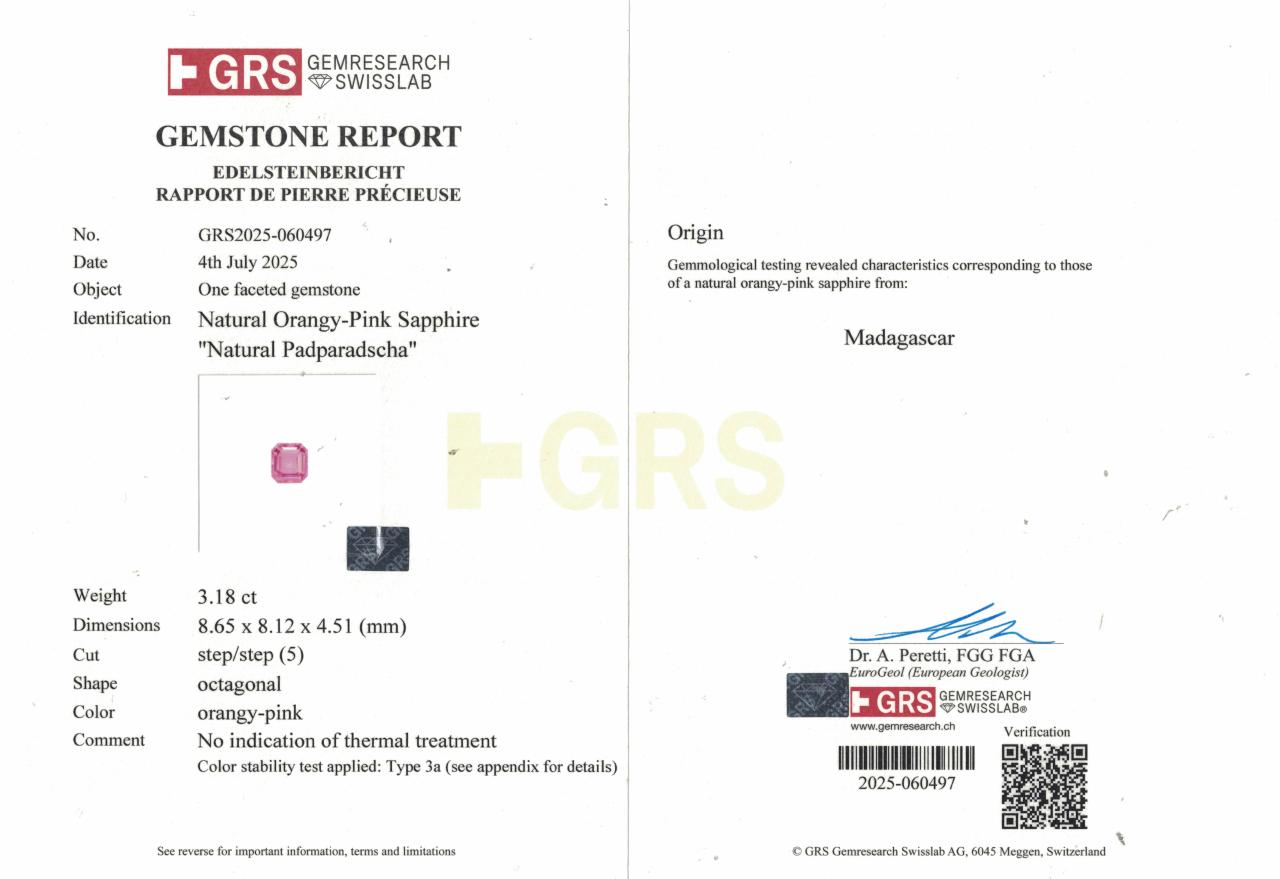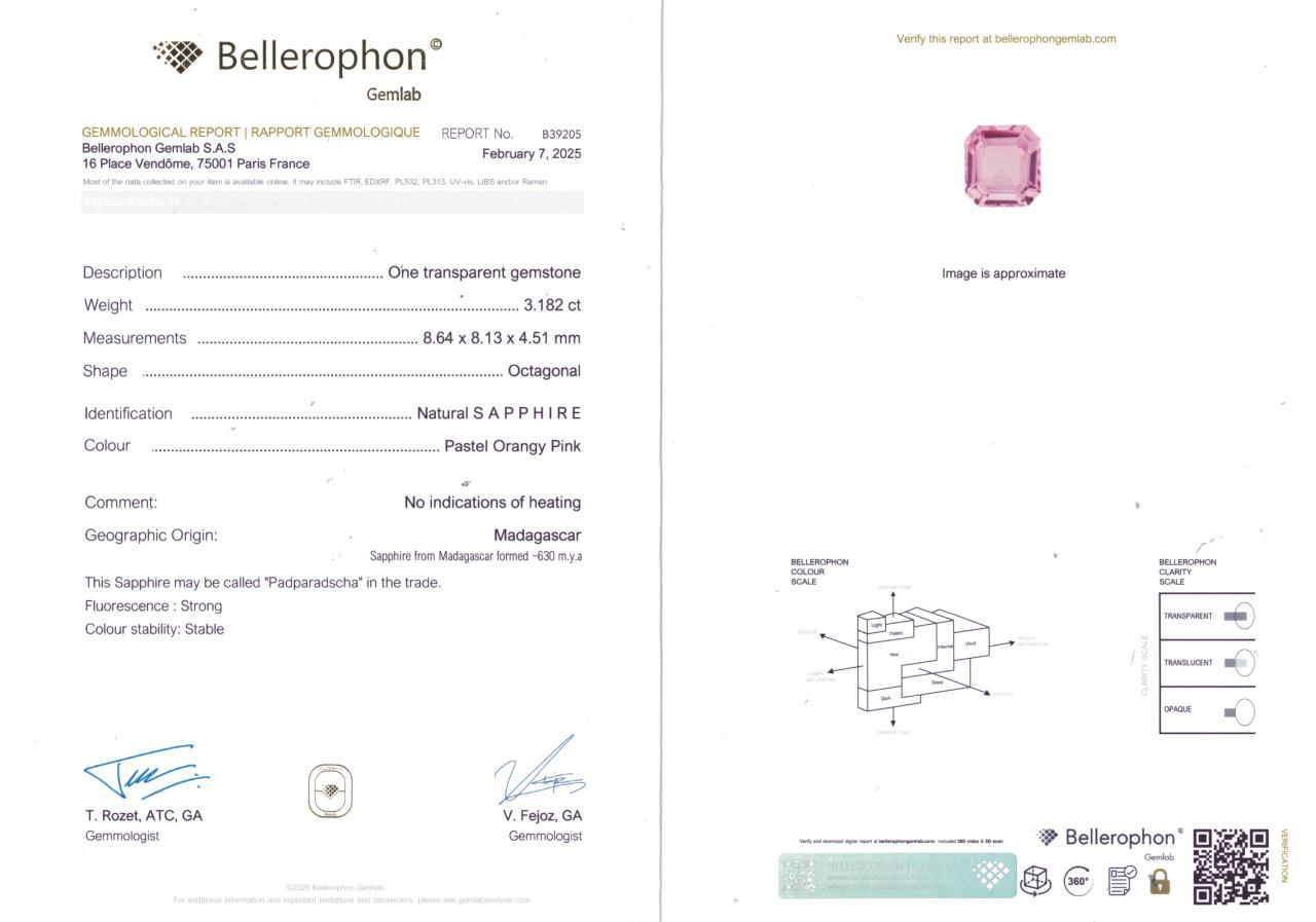 Platinum and 18ct rose gold 3.18ct octagonal step cut natural pink Madagascan Padparadscha unheated sapphire and Argyle Pink diamond ring