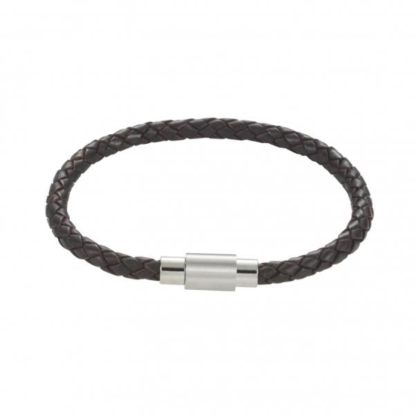 Platted brown leather and stainless steel mens bracelet 20cm