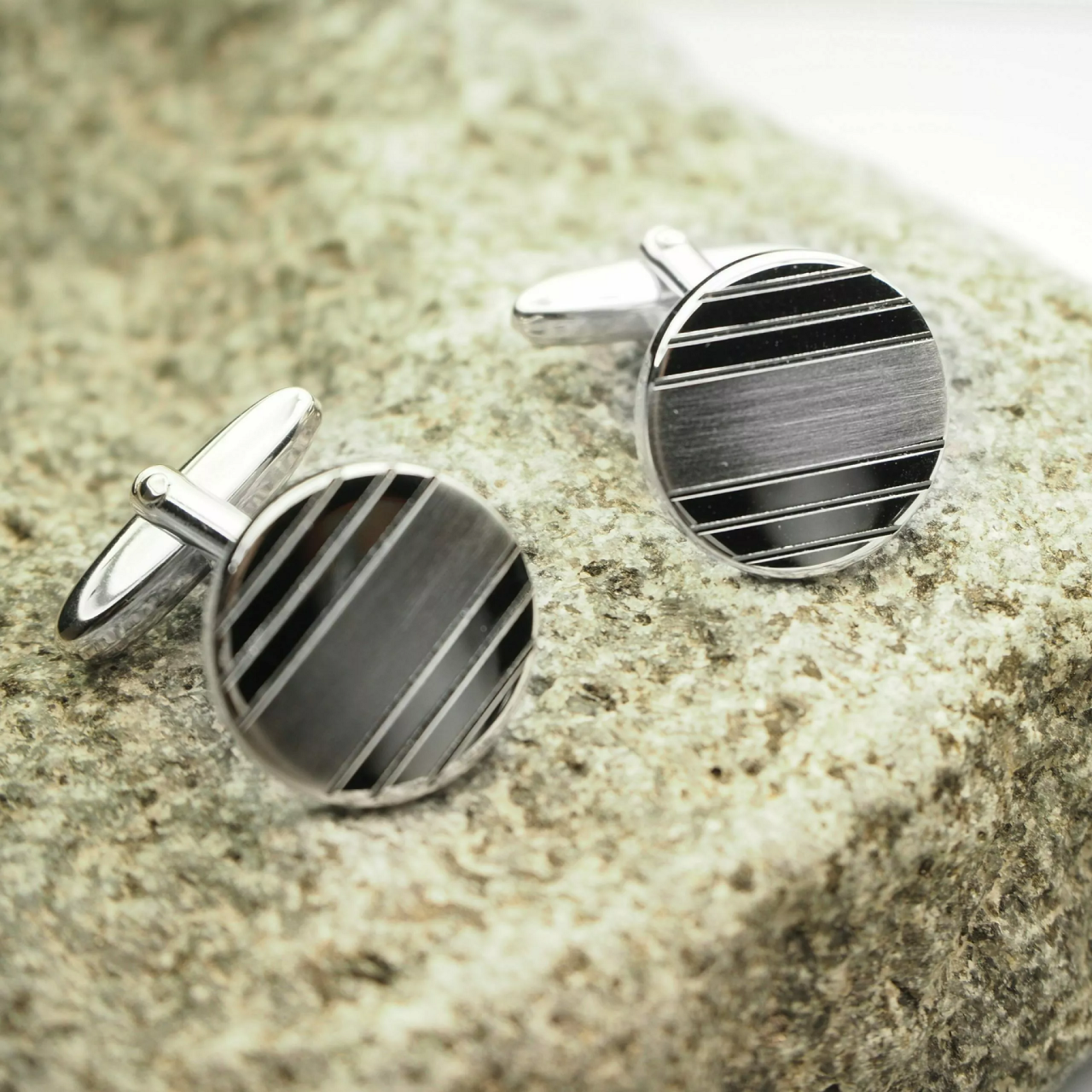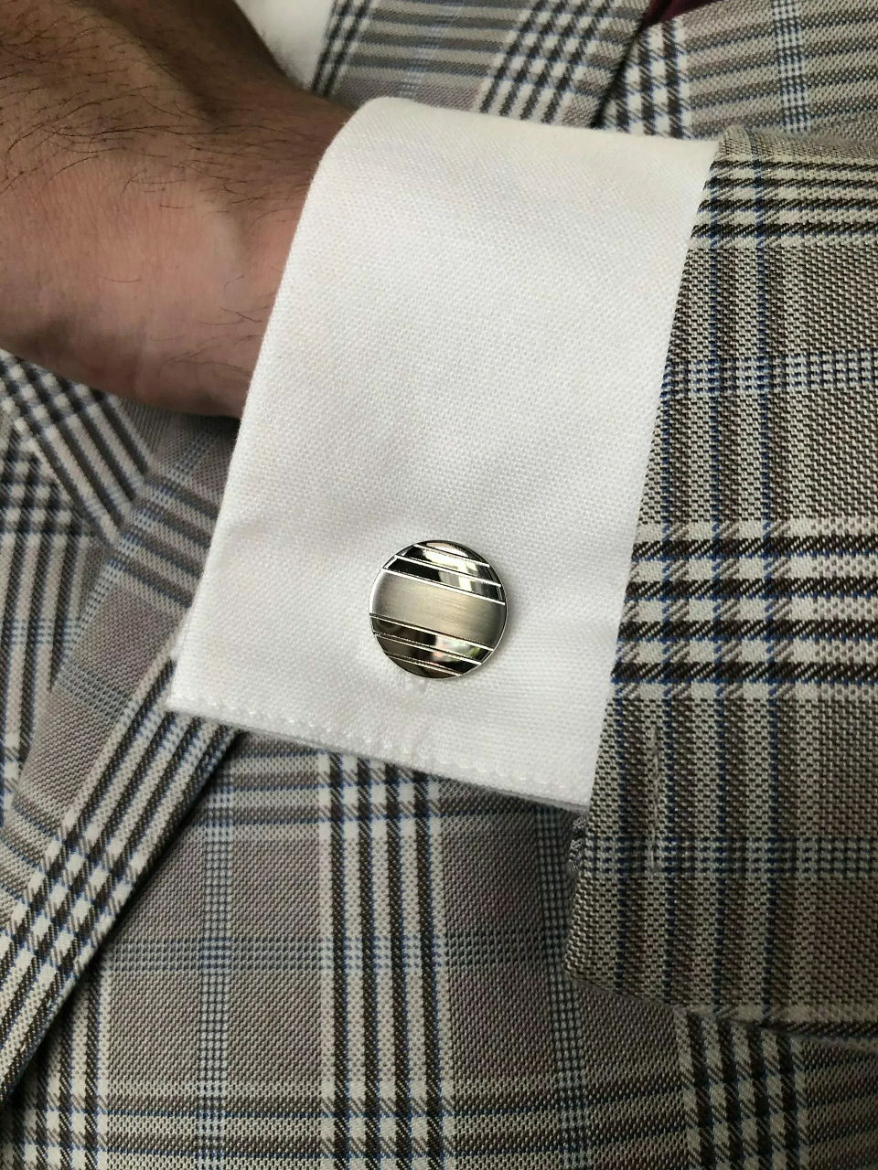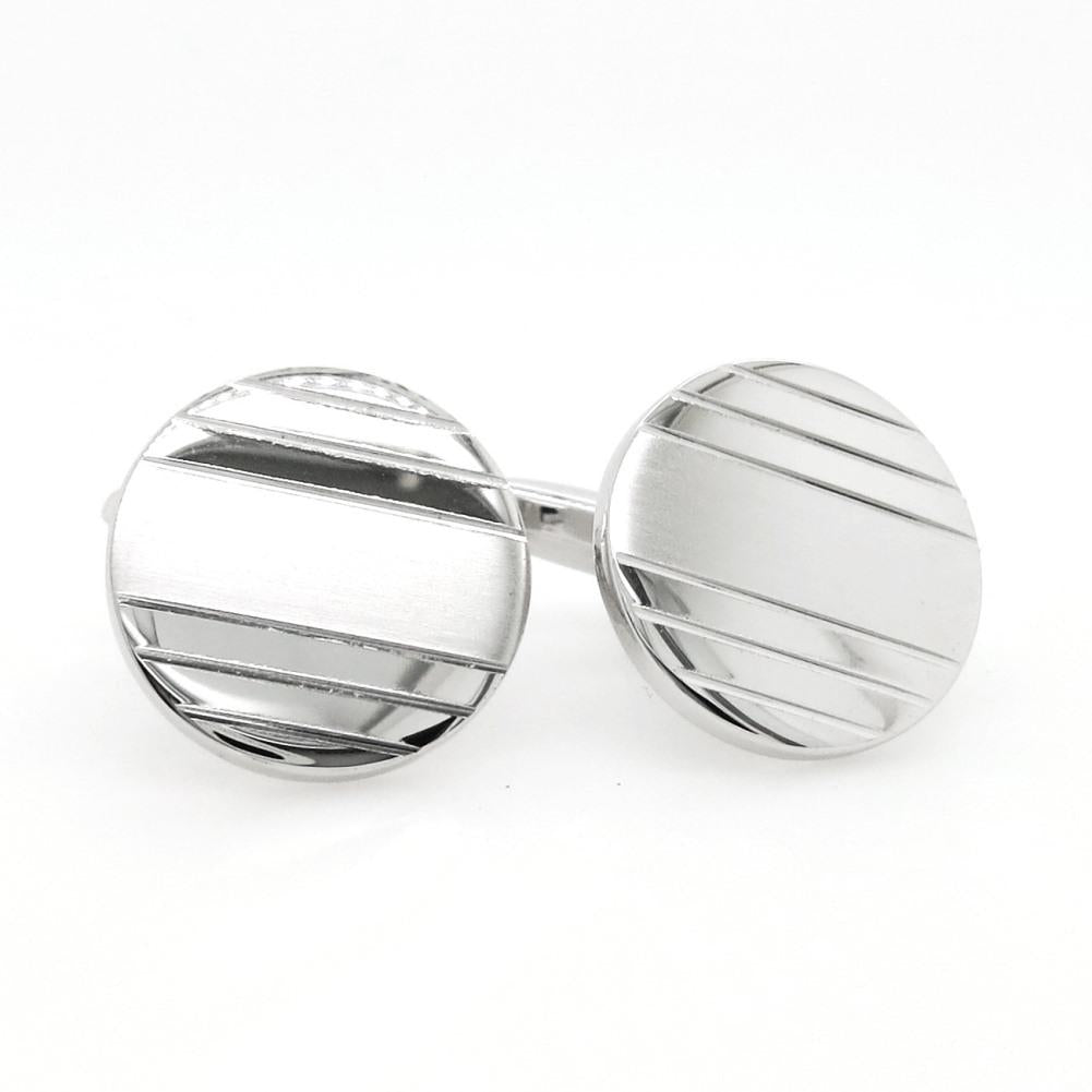 Rhodium plated metal polished and matt finish round cufflinks. Approx 1.7cm