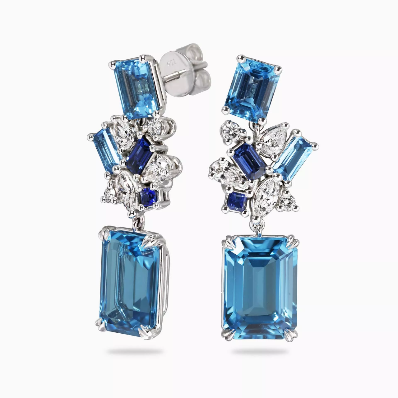 The Basilica Earrings. 18ct white gold swiss blue topaz sapphire & diamond drop earrings. Featuring 20.45ct emerald cut Swiss blue topaz, 0.93ct baguette Swiss blue topaz, 0.22ct princess cut Ceylon sapphire, 0.65ct baguette Ceylon sapphire, 4=0.67ct pear shaped diamonds, 4=0.19ct round brilliant cut diamonds and 2=0.41ct marquise diamonds